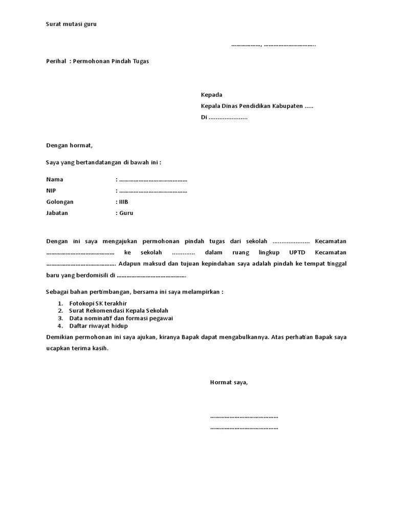 Admin mengumpulkan informasi contoh surat rekomendasi mutasi guru dari kepala sekolah. Contoh surat permohonan mutasi kerja contoh surat. Jika anda merupakan guru maka bisa meminta rekomendasi pindah tugas pns dari kepala sekolah dan dari kepala dinas untuk anda yang bekerja di . Contoh surat permohonan mutasi kerja bekerja disuatu . Seperti kita ketahui bersama, untuk dapat pindah mengajar ke sekolah lain tentu kita harus mengurus permohonan pindah tugas tersebut.